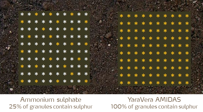 YaraVera AMIDAS makes great agronomic sense as it is a homogeneous fertilizer with 40% nitrogen and 5.5% sulphate sulphur in every granule. It supplies an even amount of nitrogen and sulphur for plant uptake compared to physical blends. AMIDAS is the ideal N:S ratio of 7.3:1 to meet the needs of a high yielding wheat and corn crop.