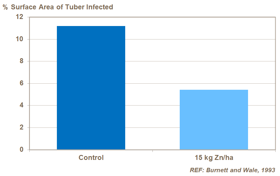 Zinc is commonly used to suppress powdery scab where the innoculum is at low levels. Only soil applications are likely to provide sufficient zinc to have an effect on powdery scab, as trials in Scotland show.