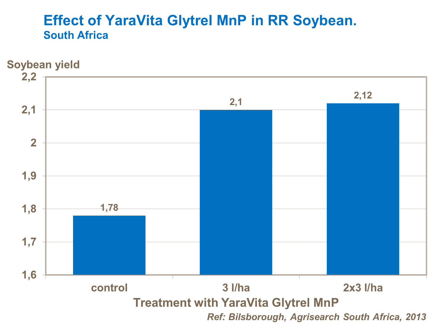 An application of 3 l/ha of YaraVita Glytrel MnP tankmixed with glyphosate gave an 18% increase in seed yield compared to the untreated control. 2 x 3 l/ha YaraVita Glytrel MnP, the first tankmixed with glyphosate and the second applied alone 14 days later gave a 19.1% increase in seed yield compared to the nil. YaraVita Glytrel MnP applied as a tank mix was safe to the crop and did not affect the ability of the glyphosate to control weeds at the site.