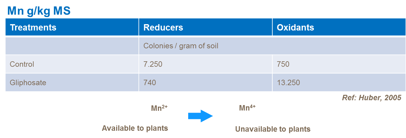Researchers have analyzed the relationship between the use of some herbicides and the decrease on Mn availability and absorption in genetically modified crops. Some studies have pointed out changes on population of microorganisms responsible for providing manganese to plants. Over a period, the plant could not absorb manganese, even though it may be abundant in the soil.