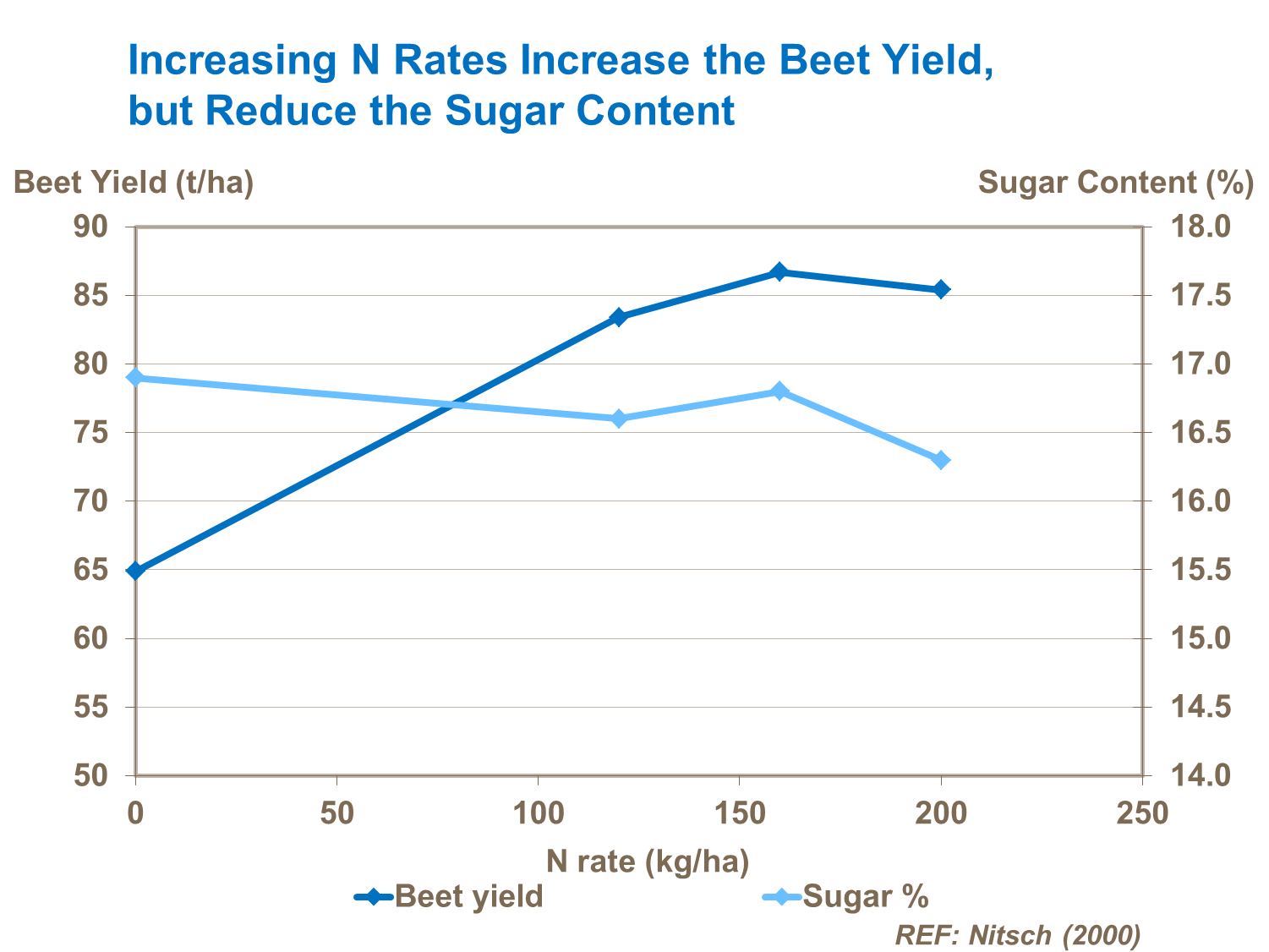 The optimum nitrogen rate for sugar yield is therefore lower than for the beet yield alone.